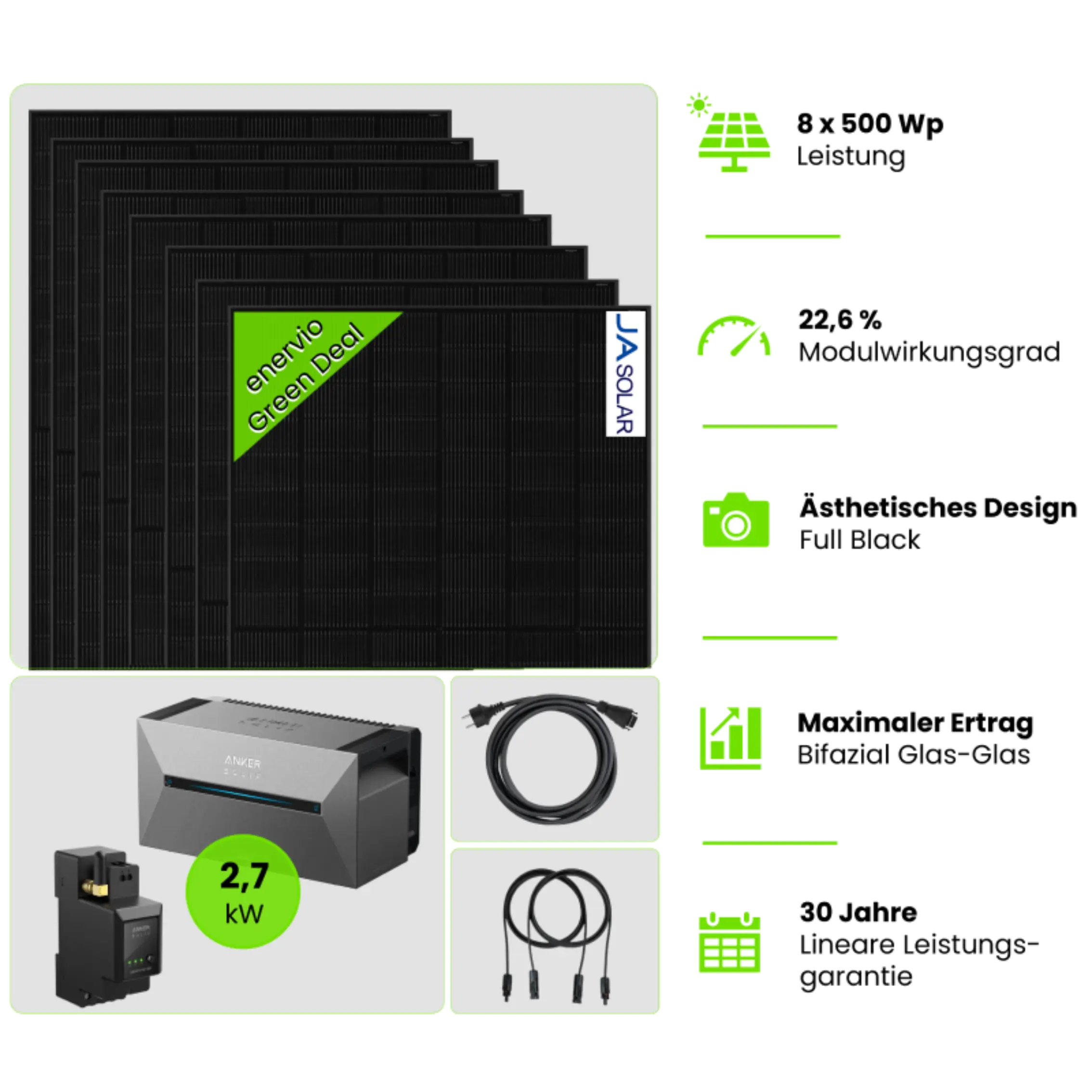 Balkonkraftwerk 2000 Wp – 4x JA Solar Full Black + Anker Solix 3 E2700 Pro + Smart Meter & 3m MC4 Kabel