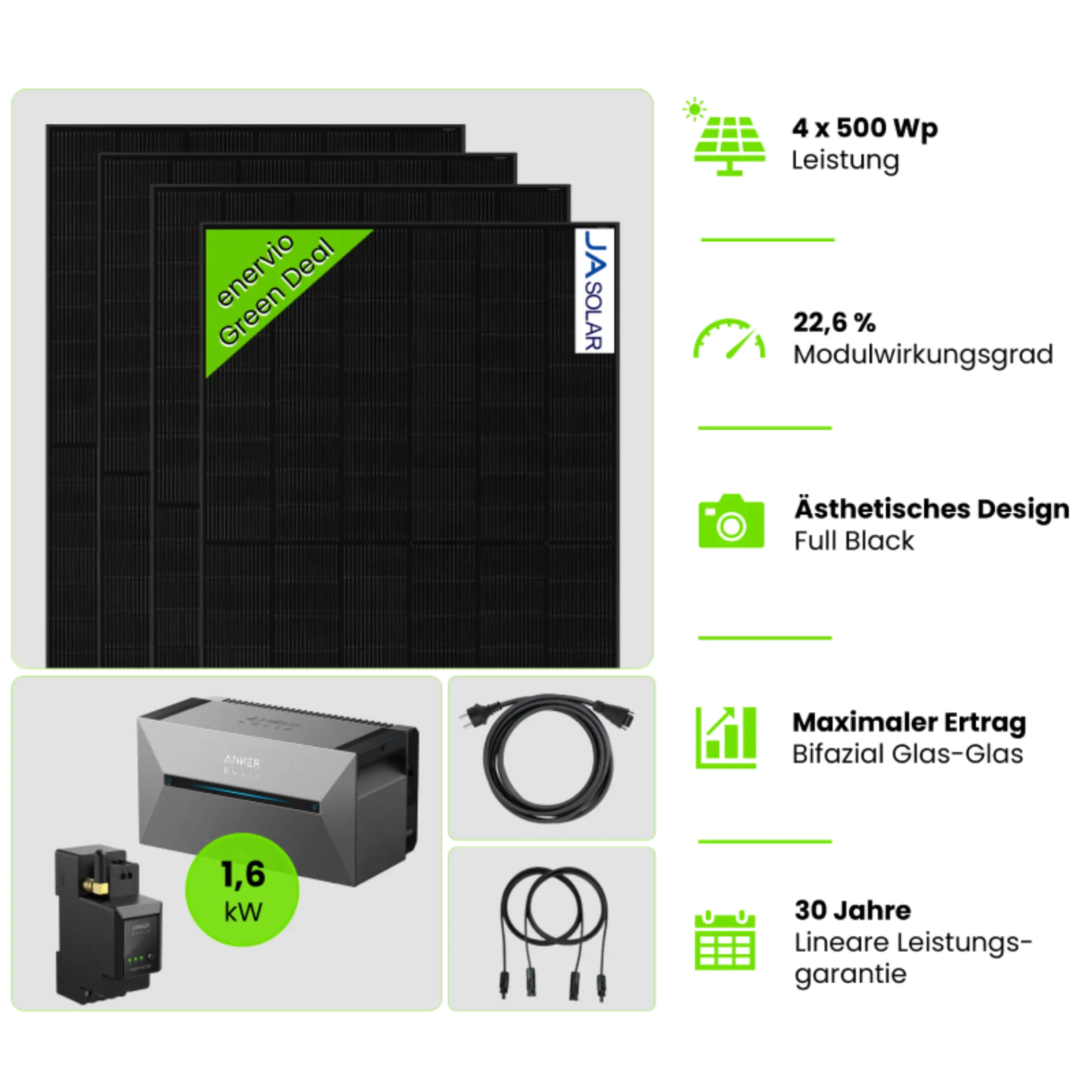 Balkonkraftwerk 900 Wp – 2xJA Solar Full Black + Anker Solix 3 E2700 Pro + Smart Meter & 3m MC4 Kabel